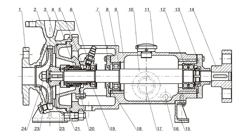 1. Pump casing 2. Impeller 3. Pump cover 4. Mechanical seal 5. Seal end gland 6. Wear sleeve 7. Front bearing gland 8. Front bearing | 9. Bearing housing 10. Shaft 11. Air vent cover 12. Back bearing 13. Backing bearing gland 14. Pump coupling 15. Bracket 16. Pipe plug | 17. Oil-analysis standard 18. Skeleton oil seal 19. Skeleton oil seal 20. O ring of seal end gland 21. Pump cover washer/O ring 22. O ring of impeller 23. O ring of impeller nut 24. Impeller nut |